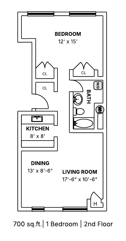 This 700-square-foot second-floor apartment offers a thoughtfully arranged one-bedroom layout ideal for comfortable living. The bedroom measures 12′ × 15′ and includes two closets for ample storage. A full bathroom is conveniently located adjacent to the bedroom. The kitchen, sized at 8′ × 8′, connects to a dining area creating a functional flow for meal preparation and dining. The living room spans 17’6″ × 10’6″, providing a spacious area for relaxation and entertaining. Additional features include a washer/dryer unit and a designated heating area, enhancing convenience and livability.
